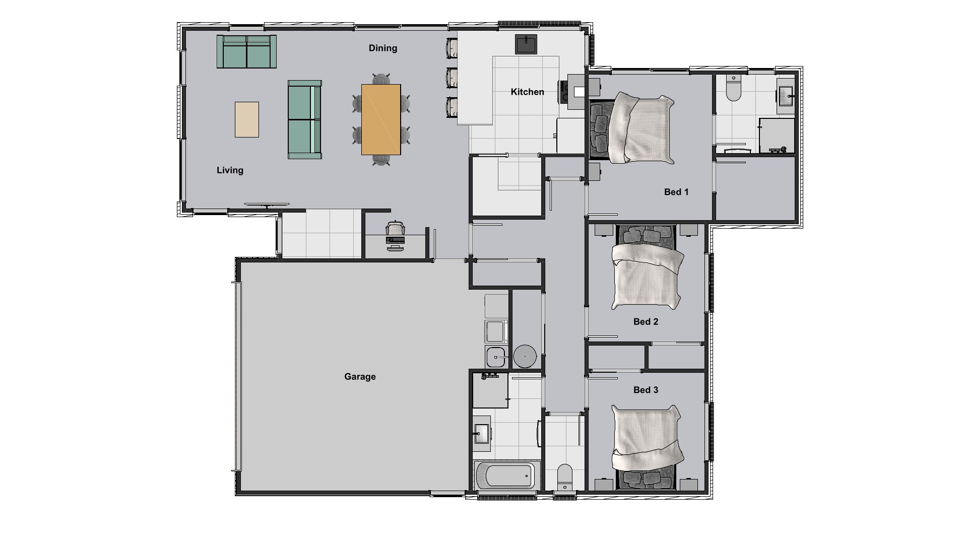 Lot 7 at Longview, Hawera features G.J Gardner’s Avon 158 plan. A great looking, minimalist, modern design that is perfectly suited to growing families, downsizers, and investors alike. This three-bedroom design meets the needs of many different family dynamics, with plenty of storage placed throughout the hall, and a separate toilet to the main bathroom. A bonus study nook situated off the wide lounge area is ideal for a work-from-home space or for the kids to complete their homework. Your kitchen offers a walk-in pantry for the family baking and an island design perfect for that busy morning breakfast rush.
